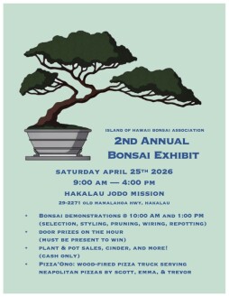 IHBA seeks to showcase bonsai groups on Hawai'i Island. Bonsai demonstrations @ 10 AM and 1:00 PM with door prizes awarded each hour (must be present to win). Plant, pot and cinder sales are cash only. Pizza'Ono will be serving wood-fired Neapolitan pizzas.