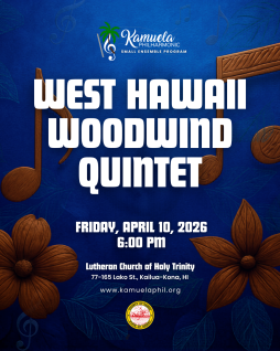 This performance is part of the Kamuela Philharmonic Small-Ensemble Program, “Bringing Live Music to the Communities Around the Island.” Their program will feature a lovely late romantic quintet by August Klughardt and a medley of delightful short works to celebrate the coming of Spring by composers such as Gershwin, Joplin, Elgar, and more!