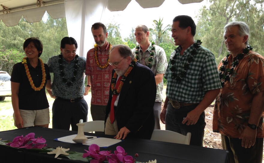 Turtle Bay Resorts hosted a bill-signing ceremony today at the scenic Kawela Bay on the North Shore. The measure, which was signed into law by the Governor, sets aside undeveloped land for future generations of residents and tourists to enjoy. HPR’s Wayne Yoshioka reports.