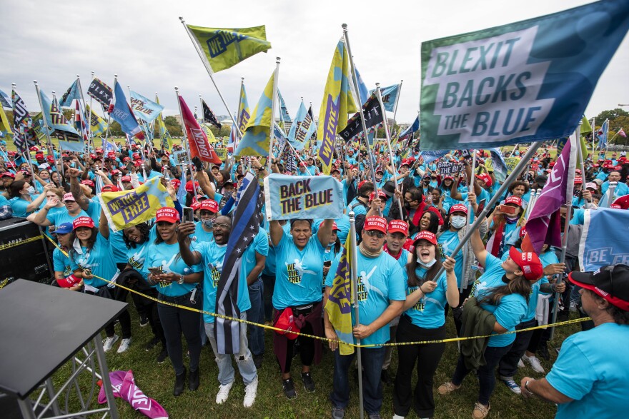 Most in the crowd that gathered for his speech on supporting law enforcement wore masks, but there was little social distancing.